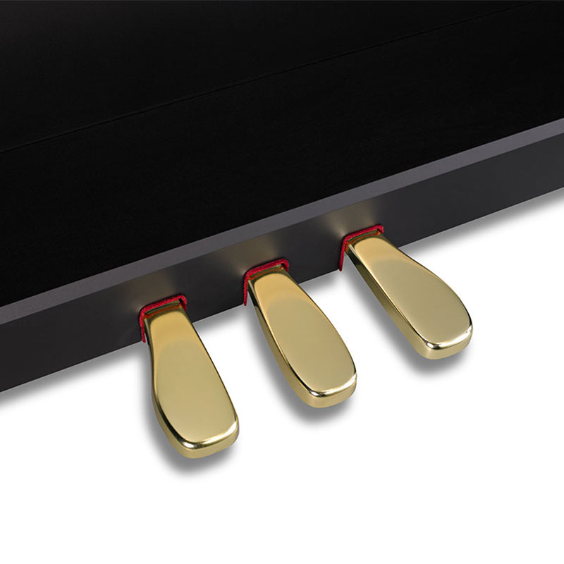Пианино оснащено блоком из трех встроенных педалей (демпфер, софт, состенуто). Положение демпферной полу-педали регулируется в пяти уровнях. В комплекте также поставляются пюпитр и держатель для наушников.