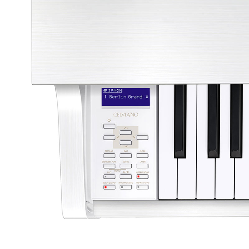 Цифровое пианино Casio Grand Hybrid GP310 WE поддерживает 26 тембров, включая 12 тембров фортепиано. Имитация струнного и демпферного резонанса со ступенчатой системой настройки (10 ступеней для каждой функции) порадует поклонников настоящего акустического звучания.