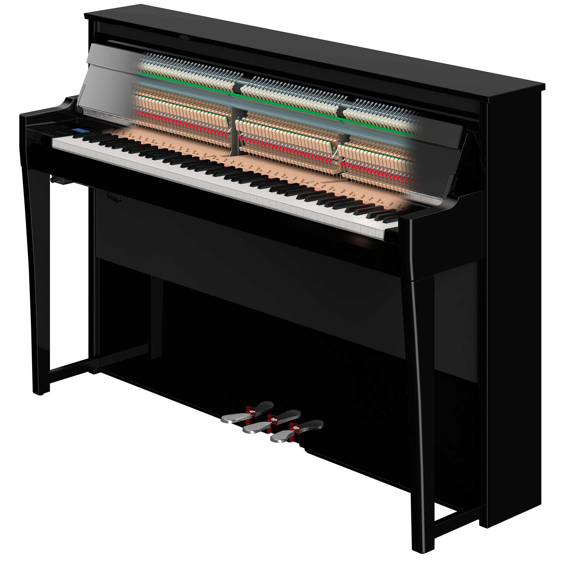 Yamaha AvantGrand NU1XA — революционное гибридное пианино, в котором акустическая механика молоточкового типа от легендарного пианино Yamaha U1 сочетается с передовой цифровой звуковой технологией. Обеспечивает аутентичность тактильных ощущений и звучания акустического инструмента в компактном корпусе. Основные особенности включают улучшенное сенсорное управление и новые педали для более реалистичного ощущения рояля. Датчики под клавишами точно определяют длительность нот и нюансы исполнения. Добавлены новые датчики молоточков для более точного определения времени и силы ударов. Усовершенствованная звуковая система: динамики верхней части с рупорной конфигурацией распространяют высокие частоты на переднюю и заднюю панели, а динамики у ножек направляют звук вверх, резонируя по корпусу пианино.