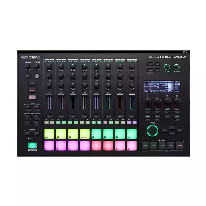 Рабочая станция MC-707 от Roland – это мощный грувбокс на 8 треков, разработанный для тех, кто не боится экспериментировать и хочет творить всегда и везде. В памяти инструмента содержатся сотни готовых битов, музыкальных фраз и отдельных звуков, каждый из которых тщательно проработан саунд-дизайнером.
