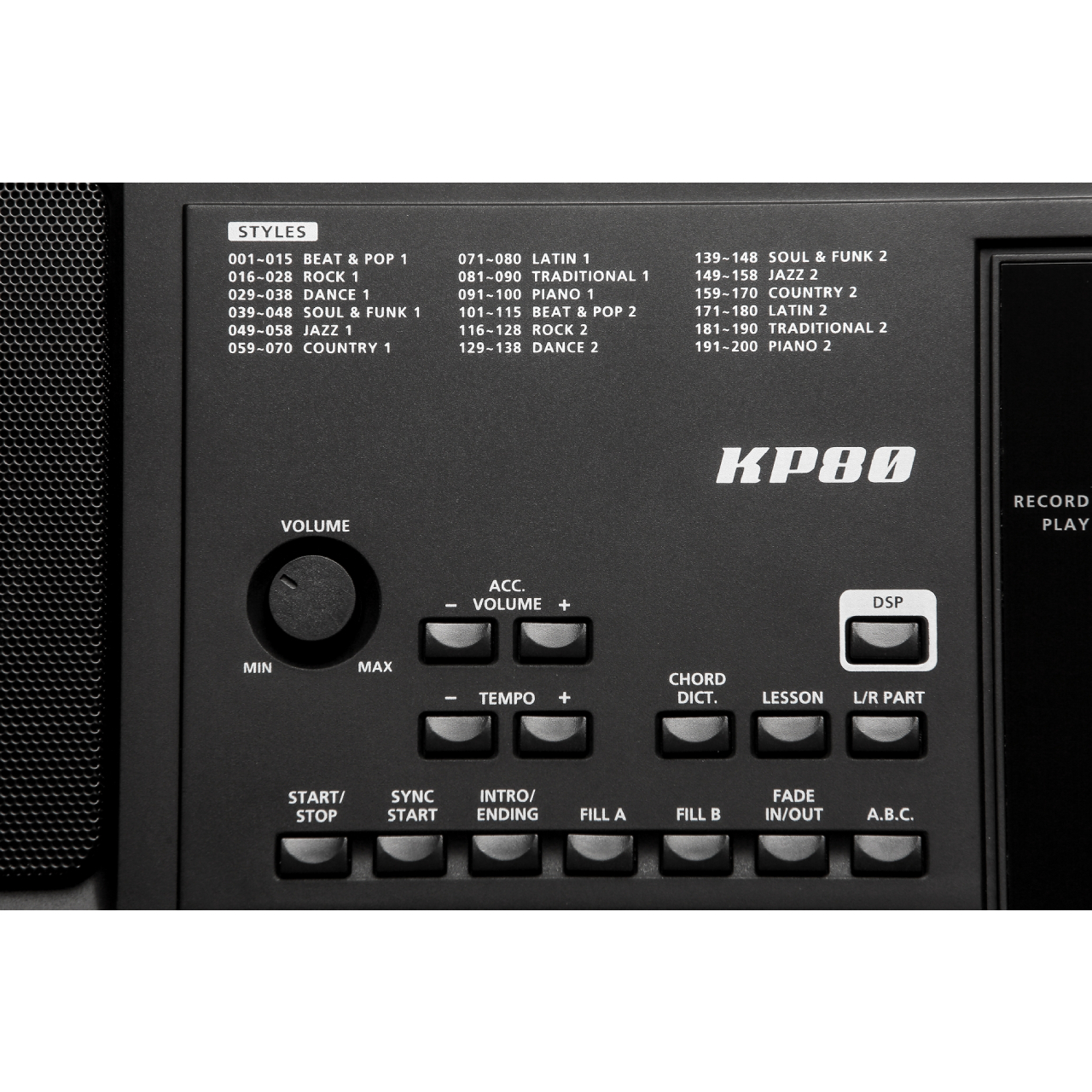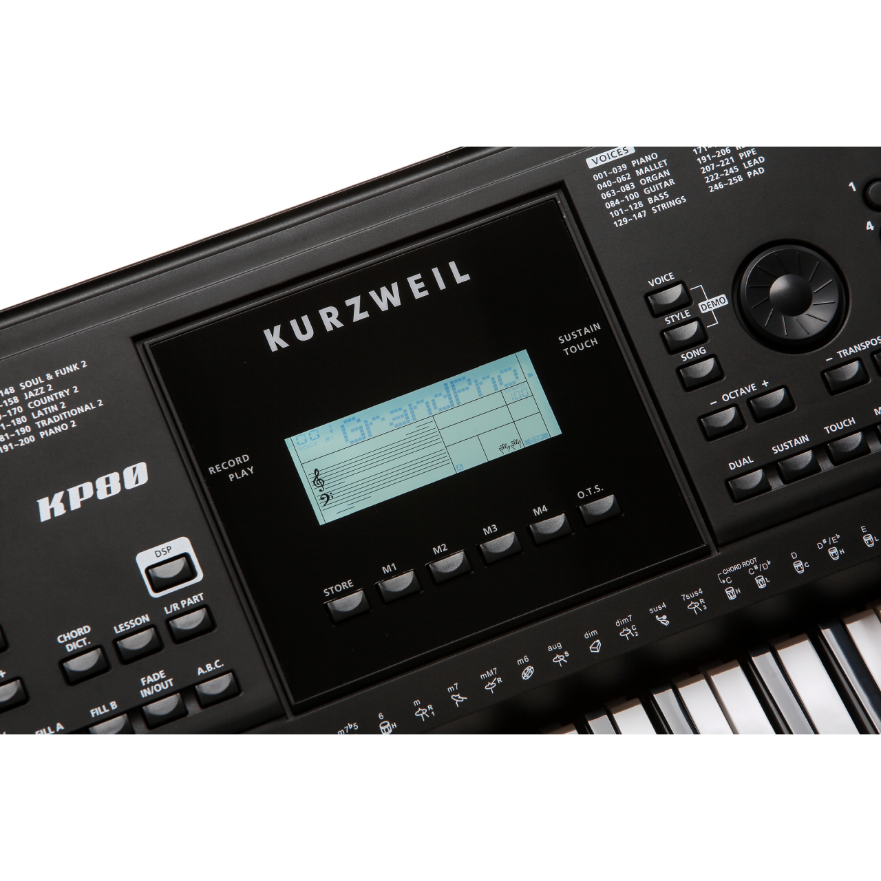 Kurzweil KP80 имеет 200 стилей автоаккомпанемента, включая встроенные интерактивные паттерны в различных музыкальных жанрах. Это позволяет вам иметь всегда под рукой целую группу аккомпанемента. Вы также можете использовать функцию записи композиций для записи своих собственной игры на синтезаторе.